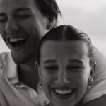 For her Fallon ‘fit, Millie wore a sleeveless top in a dark purple hue. The long-sleeve shirt was lightly dusted in sparkles and featured a feathery neckline. The top also included bell sleeves adorned in feathers.