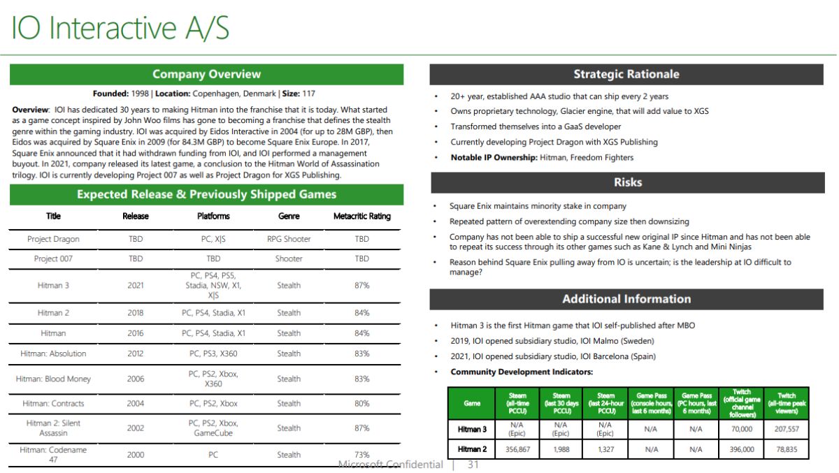 The documents, which reveal Xbox’s research into potential acquisitions, including IO Interactive, list the studio as working on a project titled “Project Dragon,” described as an RPG shooter for PC and Xbox Series X and S. Furthermore, the documents state that Project Dragon is being developed under the Xbox Game Studios publishing umbrella.